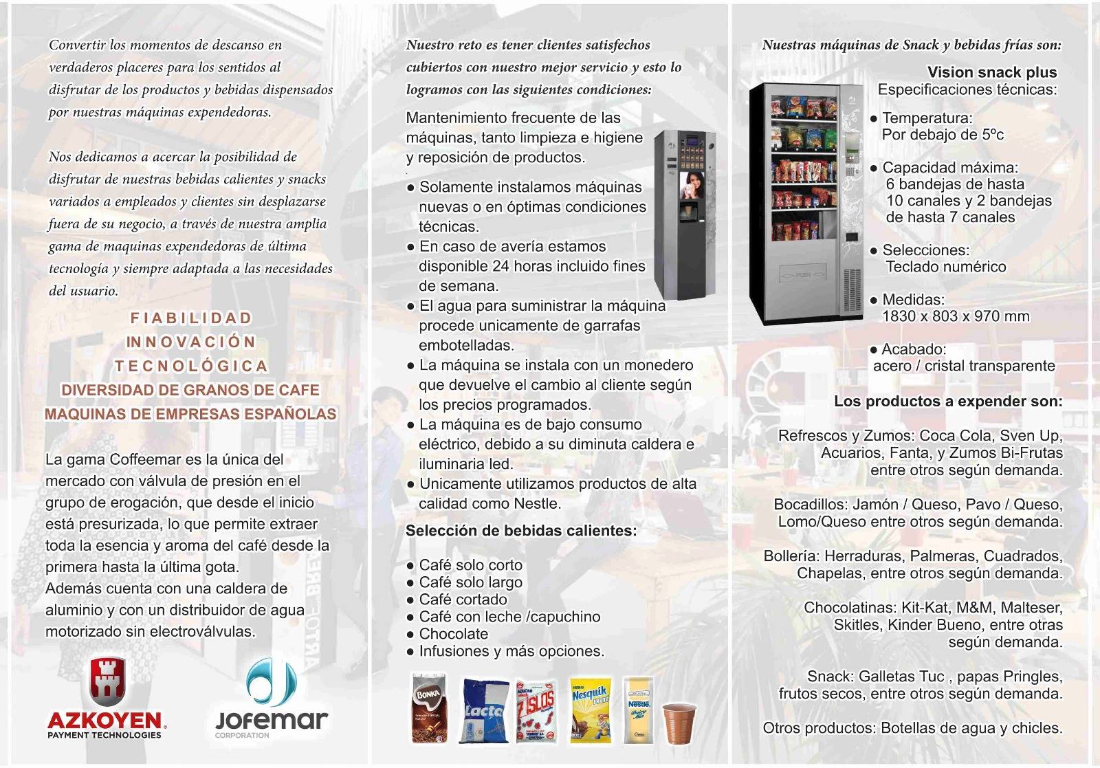 Nos dedicamos a acercar la posibilidad de disfrutar de nuestros cafés, bebidas frías y snacks variados sin la necesidad de desplazarse fuera de su negocio, a través de nuestra amplia gama de maquinas expendedoras. Contamos con la última tecnología del mercado y siempre adapada a las necesidades del cliente.